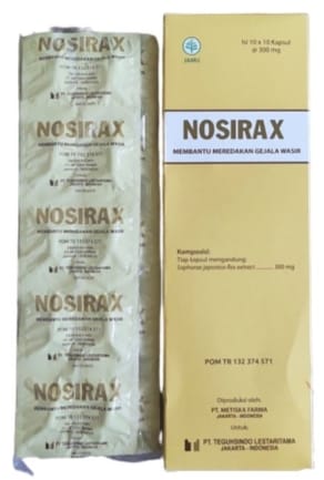 Nosirax merupakan obat ambeien yang dapat untuk membantu meredakan wasir berdarah. Nosirax mengandung ekstrak tanaman pagoda Jepang (Sophora japonica). Bahan ini dikenal memiliki efek antiperadangan dan dapat membantu menghentikan perdarahan akibat pembuluh darah yang membengkak.