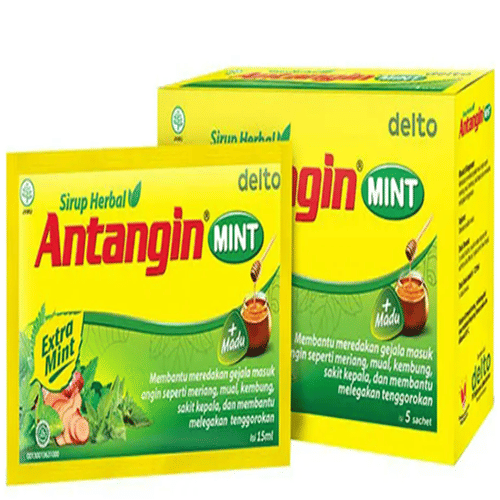 Adalah sirup herbal masuk angin dengan kandungan utama jahe, royal jelly, ginseng, serta madu. Antangin berkhasiat membantu mengatasi dan mencegah masuk angin dengan memberikan sensasi hangat pada tubuh, meriang, mual dan perut kembung, serta menghilangkan rasa capek dan pusing.