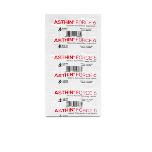 Asthin Force 6 mg memiliki bahan aktif astaxanthin yang umumnya didapatkan dari beberapa jenis algae atau hewan laut. Astaxanthin merupakan antioksidan yang dapat melindungi sel dari kerusakan akibat paparan radikal bebas serta meningkatkan fungsi sistem kekebalan tubuh.