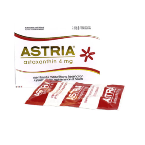Astria 4 mg mengandung astaxanthin, yaitu antioksidan alami yang berasal dari ganggang merah. Antioksidan dapat menangkal radikal bebas dari polusi, asap rokok, efek buruk sinar matahari, dan makanan yang tidak sehat. Astria 4 mg aman dikonsumsi setiap hari bila perlu.