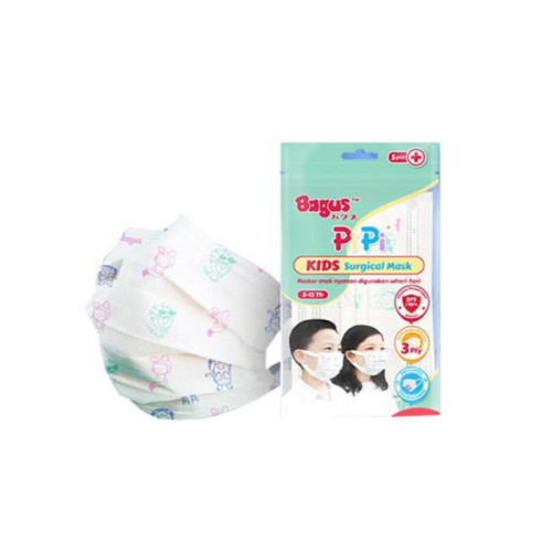 Bagus Pipi Kids Mask merupakan masker bedah untuk anak usia 5–12 tahun dengan efisiensi penyaringan bakteri ≥98%.