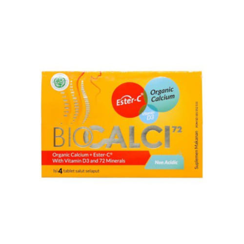 Biocalci-72 Tablet mengandung kalsium yang penting bagi kesehatan tulang, gigi, saraf, dan otot, serta ester-C dan vitamin D3 untuk meningkatkan penyerapan kalsium ke dalam tubuh.