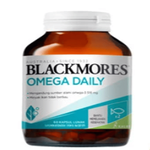 Blackmores Omega Daily merupakan sumber omega-3 (EPA 600mg) dengan konsentrasi minyak ikan lebih tinggi dibandingkan minyak ikan pada umumnya yang disesuaikan dengan dosis harian. Minyak ikan Blackmores telah diuji secara klinis bagik dari segi kualitas maupun ke-alamiannya. Produk ini bebas surfaktan dan merkuri.
