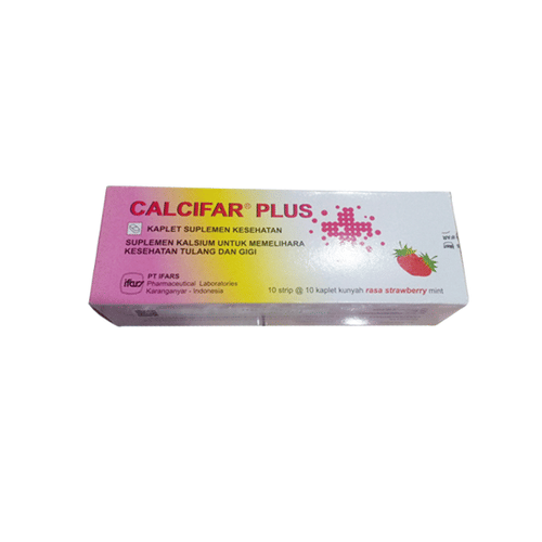Calcifar Plus Tablet Kunyah mengandung kalsium dan vitamin D3. Kombinasi bahan tersebut berperan penting dalam tubuh untuk mendukung kerja sistem saraf, pembekuan darah, dan kontraksi otot.