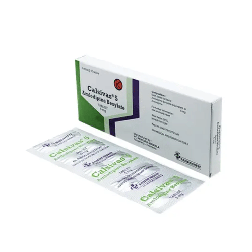 Calsivas Tablet mengandung amlodipine 5 mg. Obat ini bekerja dengan cara melemaskan otot pembuluh darah. Dengan begitu, pembuluh darah akan melebar, darah mengalir lebih lancar, dan tekanan darah pun menurun.