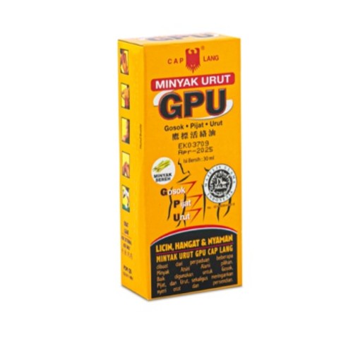 Minyak Urut GPU Cap Lang dipercaya bermanfaat untuk membantu meredakan nyeri otot, pegal linu, nyeri sendi, terkilir, sakit punggung, keseleo, serta memperlancar aliran darah.