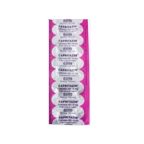 Capritazin 10 Tablet meredakan gejala atau keluhan akibat reaksi alergi, seperti gatal pada kulit, tenggorokan, dan hidung, bersin-bersin, atau biduran.
