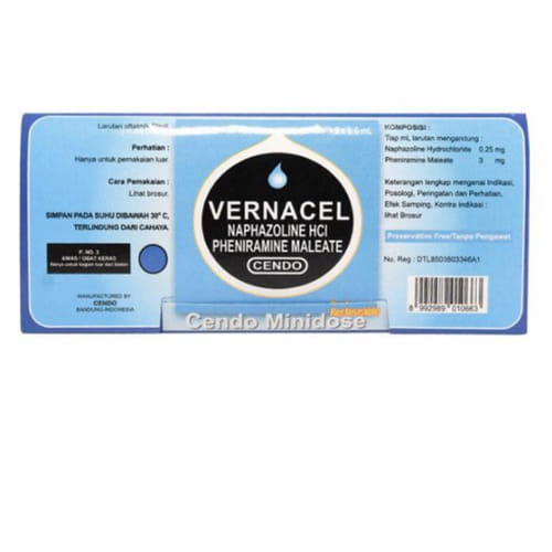 Cendo Vernacel Tetes Mata Steril mengandung kombinasi naphazoline hydrochloride dan pheniramine maleate. Naphazoline hydrochloride bekerja dengan mengecilkan pembuluh darah yang melebar di mata untuk mengurangi mata merah. Pheniramine maleate bekerja sebagai antihistamin yang menghambat kerja histamin sehingga gejala alergi bisa mereda.