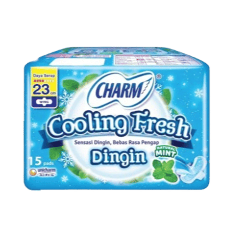 Charm Cooling Fresh Wing 23 Cm 15 Pads merupakan pembalut wanita saat menstruasi yang memberikan sensasi dingin dengan ekstrak daun mint dan keamanan sepanjang tidur di malam hari.