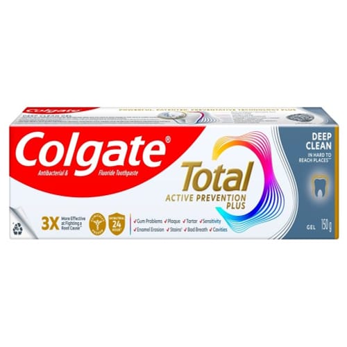Colgate® Total Deep Clean merupakan pasta gigi gel dengan formula Pencegahan Aktif Plus terbaru yang 3x lebih efektif* dalam melawan akar penyebab masalah utama kesehatan mulut seperti masalah gusi, plak, karang gigi, sensitivitas, bau mulut, dan gigi berlubang.