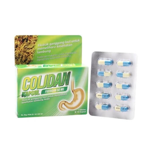 Colidan 50 mg Kapsul mengandung bahan aktif fucoidan yang berasal dari ekstrak ganggang laut. Fucoidan bekerja dengan cara meningkatkan ketebalan lapisan lambung sehingga mampu melindungi lambung dari asam lambung berlebih.