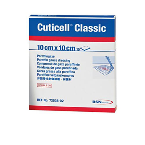 Cuticell Classic 10x10 cm dilapisi dengan soft-paraffin untuk memudahkan pergantian pembalut luka dan menjaga kelembaban kulit yang terluka.