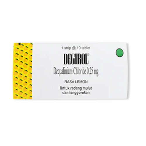 Degirol 0,25 mg Tablet bermanfaat untuk mengobati sakit tenggorokan, sariawan, radang amandel, atau radang pada mulut dan gusi akibat infeksi bakteri dan jamur.