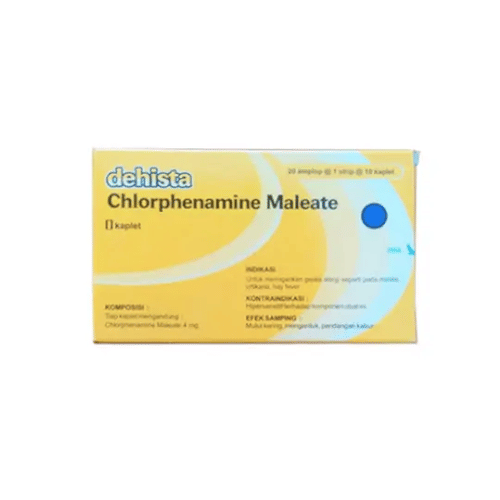 Dehista 4 Mg 10 Tablet bermanfaat untuk meredakan gejala alergi pada kondisi rhinitis, rhinitis alergi, atau biduran. Gejala alergi yang dimaksud misalnya, mata berair, hidung tersumbat, pilek, bersin, batuk, serta gatal pada kulit, hidung, mata, dan tenggorokan.