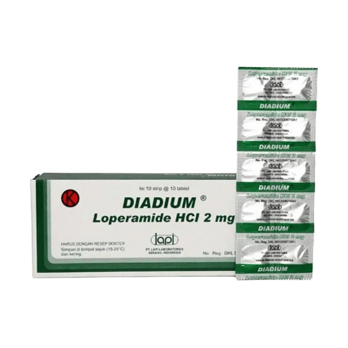 Diadium 2 mg mengandung loperamide. Obat ini bekerja dengan cara memperlambat gerakan usus. Dengan begitu, frekuensi buang air besar bisa berkurang dan feses menjadi lebih padat saat keluar.