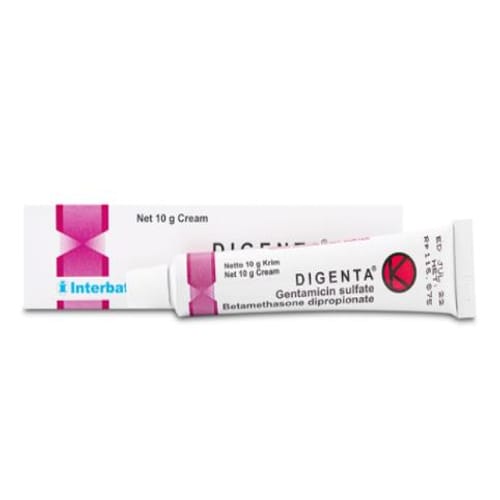 Digenta Krim 10 gr mengandung antibiotik gentamicin dan kortikosteroid betamethasone. Gentamicin bekerja dengan cara menghentikan dan mencegah pertumbuhan bakteri penyebab infeksi.