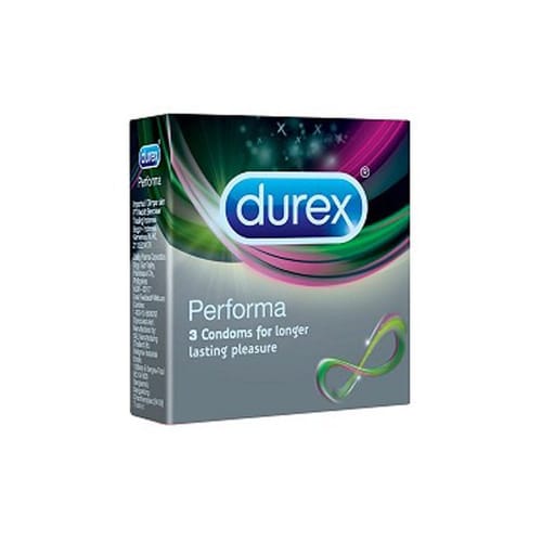 Kondom Durex Performa terbuat dari bahan latex alami dan mengandung pelumas khusus dan benzocaine 5% yang dapat membuat performa pria lebih tahan lama.