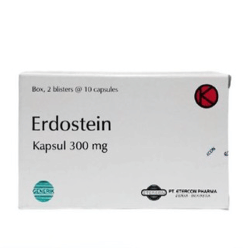 Erdostein 300 mg Kapsul meupakan obat yang dapat digunakan untuk mukolitik dan sebagai sekretolitik pada gangguan saluran nafas akut dan kronik.