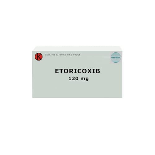 Etoricoxib 120 mg 10 Tablet bermanfaat untuk meredakan nyeri dan pembengkakan pada penderita osteoarthritis, rheumatoid arthritis, ankylosing spondylitis, atau radang sendi akibat penyakit asam urat (gout).