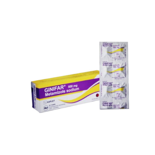 GINIFAR 500MG TABLET merupakan obat untuk meredakan rasa nyeri seperti sakit gigi, sakit kepala, nyeri menstruasi serta dapat menurunkan panas. Antalgin mengandung senyawa aktif Methampyrone dengan cara kerja menghambat produksi hormon prostaglandin, yaitu hormon yang memicu peradangan, nyeri, dan demam.