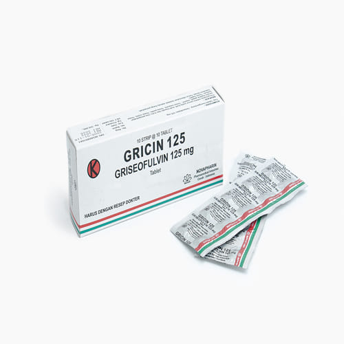 Gricin 125 mg 10 Tablet termasuk dalam golongan obat antijamur. Griseofulvin bekerja dengan cara mengendap di sel keratin yang ada di permukaan kulit, sehingga mencegah sel jamur untuk berkembang biak dan menyerang kulit.