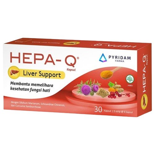 Hepa - Q kapsul dengan komposisi Silybum marianum extract, Curcuma xanthorrizae extract, Oleum xanthorrizae, Fructus schisandrae extract memiliki khasiat membantu membersihkan dan memperbaiki fungsi hati