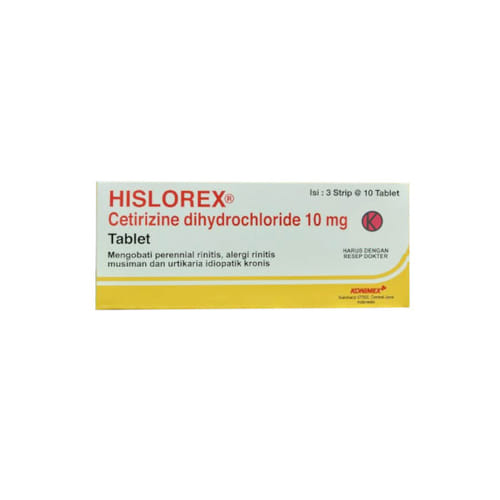 Hislorex 10 Mg 10 Tablet bermanfaat untuk mengatasi gejala alergi, seperti bersin-bersin, pilek, hidung tersumbat, ruam atau rasa gatal di kulit.