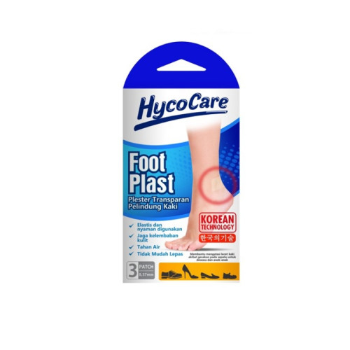 Hycocare Foot Plast® adalah plester transparan pelindung kaki berbentuk lembar yang lembut, elastis dan nyaman, menjaga kelembaban kulit, transparan, berperekat sendiri, terbuat dari hydrocolloid medis tahan air (waterproof) dan tidak mudah lepas. Dengan teknologi korea, Hycocare Foot Plast hadir sebagai solusi untuk mencegah dan melindungi kaki dari luka lecet.