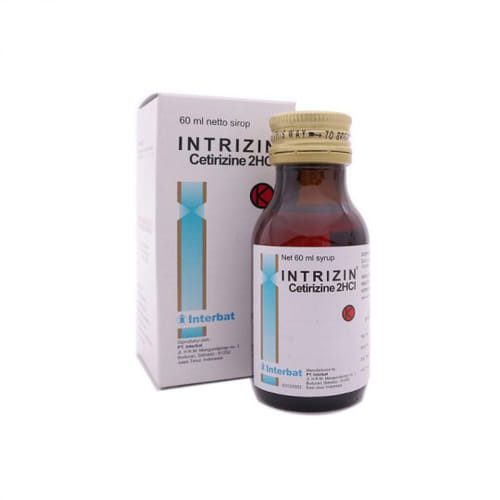 Intrizin Sirup 60 Ml mengandung Cetirizine diHCl. Cetirizine merupakan antihistamin generasi kedua yang merupakan antagonis kuat dan sangat selektid terhadap histamin perifer H1 reseptor. Obat ini digunakan untuk mengobati berbagai kondisi alergi (Rhinitis perennial, rhinitis alergi musiman dan kronis, atau urtikaria idiopatik).