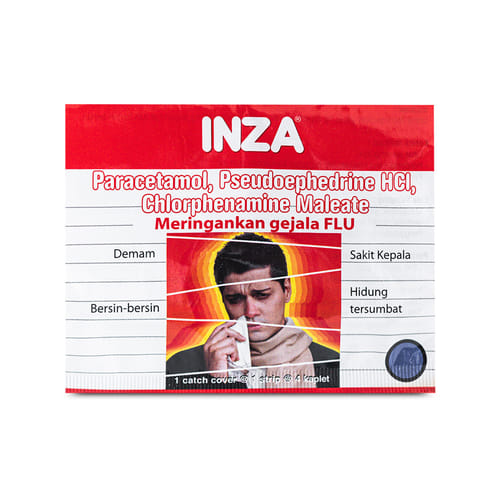 Inza 4 Kaplet merupakan obat yang mengandung Paracetamol dan Pseudoephedrine HCI yang digunakan untuk membantu meringankan gejala flu seperti demam, pusing, sakit kepala, bersin-bersin dan hidung tersumbat. Bekerja sebagai analgesik-antipiretik , antihistamin dan dekongestan hidung.