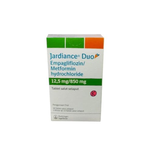 Jardiance Duo 12.5 mg/850 mg tablet memiliki kandungan bahan aktif Metformin HCl dan Empagliflozin. Metformin HCl termasuk golongan obat Biguanid yang bekerja dengan cara menekan produksi glukosa hati dan menambah sensitifitas terhadap insulin. Metformin digunakan untuk menurunkan kadar gula darah yang meningkat pada penderita diabetes. Sedangkan Empagliflozin merupakan obat yang berfungsi membantu mengontrol gula darah dalam tubuh pasien.