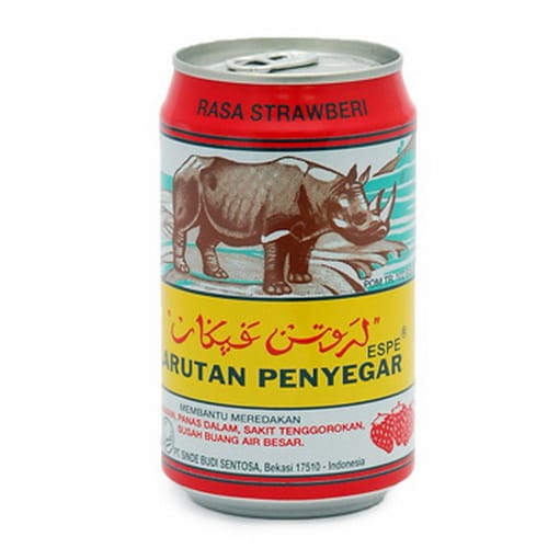 Larutan Cap Kaki Tiga Kaleng Rasa Stroberi 320 ml bermanfaat untuk meredakan panas dalam, sariawan, tenggorokan kering, dan membantu menyegarkan badan