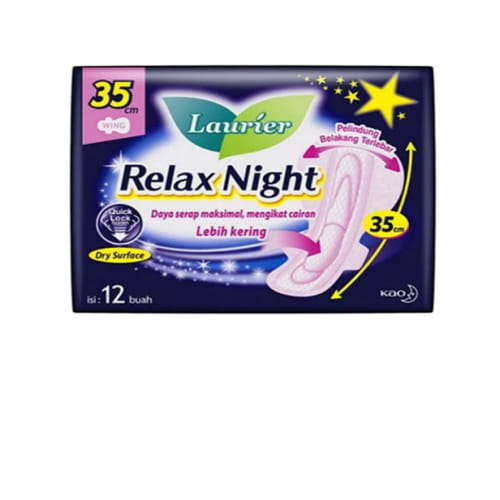 Laurier Relax Night Wing 35 cm memiliki Quick Lock System dan Dry Surface yang mampu menyerap menstruasi lebih cepat sehingga permukaan pembalut lebih kering. Pembalut ini dilengkapi pelindung belakang dan sayap pelindung untuk mencegah pembalut bergeser atau bocor.