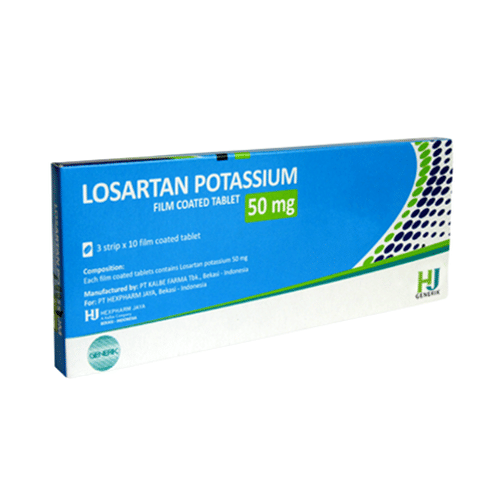 Losartan 50 mg merupakan Angiotensin II receptor blocker (ARB) yang bekerja dengan cara menghambat reseptor angiotensin II, sehingga pembuluh darah yang sebelumnya menyempit dapat melebar. Dengan begitu, darah bisa mengalir dengan lebih lancar dan beban kerja jantung bisa berkurang.