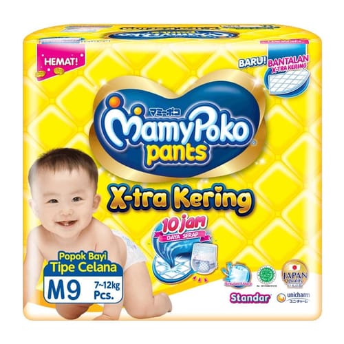 Mamy Poko Pants Standar M-9 merupakan popok celana untuk bayi dengan berat badan 7-12 kg. Mamy Poko Pants Standar memiliki daya serap tahan hingga 10 jam dan dilengkapi dengan sirkulasi udara sehingga kulit bayi tetap kering dan lembut. Ban pinggang lembut dan elastis sehingga mudah dan nyaman dipakai. Setelah pemakaian, ban Mamy Poko Pants mudah untuk disobek. Mamy Poko Pants didesain dengan gambar yang lucu dan menggemaskan.