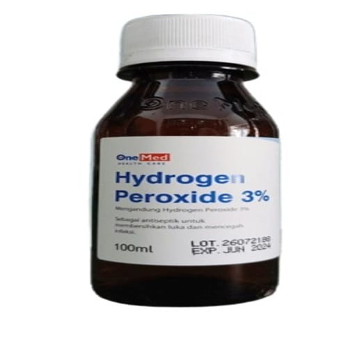 One Med Hydrogen Peroxide 3% 100 Ml mengandung cairan hidrogen peroksida. Hidrogen Peroksida adalah larutan asam lemah berwarna biru muda yang merupakan oksidator kuat. Produk ini digunakan untuk penggunaan luar seperti digunakan sebagai detokdifikasi saat mandi, menyembuhkan jamur, bisul, atau infeksi lainnya di kulit, antiseptik, dan desinfektan. Produk One Med Perhidrol ini menggunakan deionized water yang menjaga kestabilan dan mengandung stabilizer untuk mencegah reaksi penguraian H2O2 menjadi O2 dan H2O. Kemasan One Med Perhidrol dikemas dalam botol kaca yang inert dengan warna amber yang melindungi dari sinar matahari langsung, sehingga konsentrasinya lebih stabil