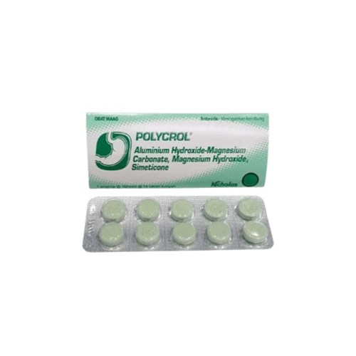 Polycrol 10 Tablet mengandung aluminium hidroksida, magnesium hidroksida, dan simethicone. Obat ini bekerja dengan cara menetralkan asam lambung sehingga rasa nyeri di ulu hati (sakit maag) akibat iritasi asam lambung berkurang.