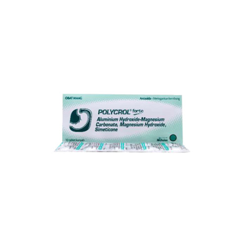Polycrol Forte Tablet mengandung alumunium hidroksida-magnesium karbonat, magnesium hidroxida, dan simethicone. Alumunium hidroksida dan magnesium hidroxida berperan sebagai antasida yang bekerja dengan cara menetralkan asam lambung.