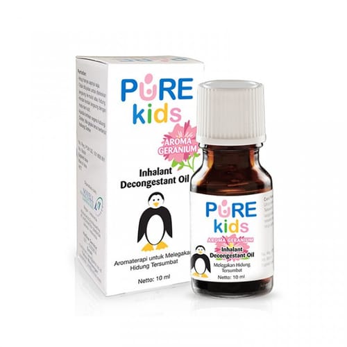 Purekids Inhalant Decongestant Oil 10 Mlmerupakan aromaterapi dengan aroma Geranium untuk melegakan pilek & hidung tersumbat tanpa Obat, dengan cara dihirup uapnya. Dengan berbagai macam kandungan, seperti: Eucalyptus Oil,Cajuput Oil, Clove Oil, Juniperberry Oil, Dementholised Mint Oil, Methyl Salicylate. Bahan alami dalam Purekids Inhalant langsung bekerja ke sumber masalah dari Pilek yaitu mengencerkan mucus (lendir) dan melegakan hidung yang tersumbat. Pemakaian tidak kontak dengan kulit sehingga tidak mengiritasi kulit.