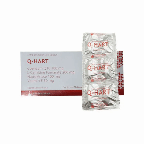 Q-Hart 6 Tablet mengandung nattokinase dan coenzyme Q10. Nattokinase adalah enzim yang membantu mengencerkan darah dan mencegah terjadinya penggumpalan darah. Sementara itu coenzyme-Q10 bekerja sebagai antioksidan yang melindungi sel dari kerusakan dan berperan dalam metabolisme tubuh.