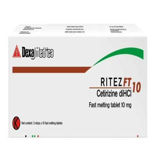 Ritez 10 mg Tablet bekerja dengan cara menghalangi kerja histamin, yaitu zat kimia yang memicu munculnya reaksi alergi saat seseorang terpapar alergen.