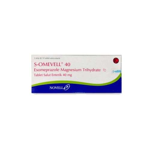 S-Omevell 40 mg merupakan obat dengan kandungan Esomeprazole. Esomeprazole termasuk obat golongan penghambat pompa proton/Proton Pump Inhibitors (PPI). Esomeprazole memilki efek menurunkan produksi asam lambung. Obat ini digunakan untuk Gastroesophageal Reflux Disease (GERD) dan kondisi lainnya yang diakibatkan oleh kenaikan asam lambung seperti refluks esofagal erosif. Obat ini juga digunakan untuk ulkus peptikum yang disebabkan H.Pylori dalam terapi kombinasi dan yang diakibatkan konsumsi OAINS. Esomeprazole adalah S-isomer dari omeprazole yang bekerja dengan menghambat sistem enzim adenosin trifosfatase hidrogen-kalium (pompa proton) dari sel parietal lambung. Penghambatan ini menyebabkan penghambatan sekresi asam lambung.