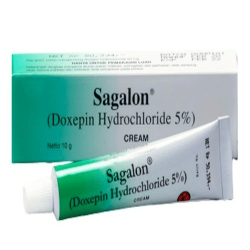 Sagalon 5% Krim 10 G merupakan obat yang digunakan secara topikal untuk pengobatan jangka pendek (8 hari) pada pasien yang menderita pruritus sedang sampai berat pada ekzema. Sagalon mengandung zat aktif Doxepin HCl 5% yaitu obat golongan antihistamin (reseptor H1 dan H2) yang bekerja dengan menghambat aktivitas histamin secara kompetitif sehingga bekerja juga sebagai anti pruritus.