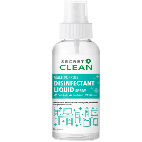 Secret Clean Disinfectan Liquid Spray 100 Ml dengan kandungan Benzalkonium chloride dapat membunuh kuman dan bakteri pada benda-benda di sekitar Anda, seperti gagang pintu, meja, pegangan tangan pada kursi dan lain-lain, serta dibuat dengan formula yang aman untuk penggunaan pada tubuh. Aman bila terkena makanan (buah, sayur), cukup lap dengan tissue/bilas dengan air mengalir (tidak untuk disemprotkan pada makanan seperti nasi/lauk pauk/snack sebelum dimakan).