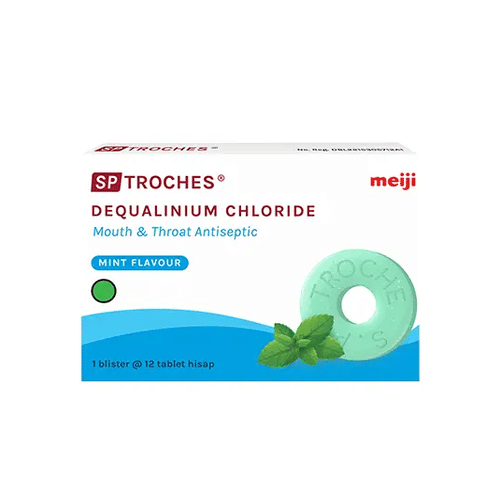 Tablet hisap pelega tenggorokan dengan kandungan dequalinium chloride yang bermanfaat untuk membantu mengatasi radang tenggorokan.