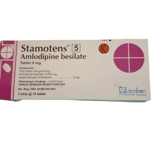 Stamotens 5 mg 10 Tablet dengan komposisi Amlodipine Besylate digunakan sebagai Anti hipertensi dengan melemaskan dinding dan memperlebar diameter pembuluh darah sehingga memperlancar aliran darah dan mengurangi tekanan darah serta mengatasi serangan angina.