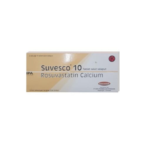 Suvesco 10 mg Tablet mengandung rosuvastatin. Obat ini mengurangi kadar kolesterol dalam darah dengan cara menghambat enzim di hati yang memproduksi kolesterol.