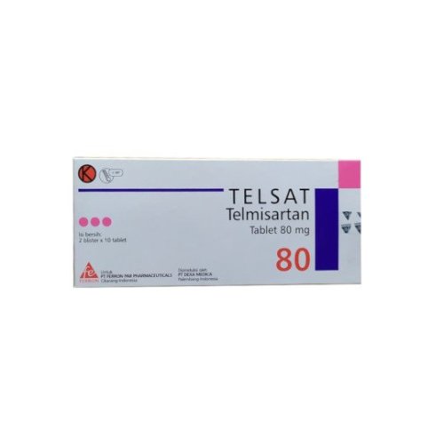 Telsat 80 mg memiliki kandungan zat aktif Telmisartan yang digunakan untuk menurunkan tekanan darah tinggi. Selain itu, Telsat juga dapat digunakan untuk mencegah gejala penyakit jantung. Telsat menghasilkan efek penurunan tekanan darah dengan secara selektif mengikat pengikatan reseptor angiotensin II ke AT1.