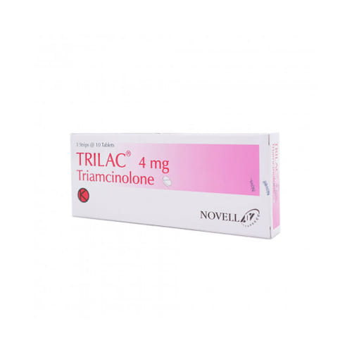 Trilac 4 mg merupakan obat yang digunakan untuk terapi supresi inflamasi (peradangan) dan untuk menangani gatal-gatal, kemerahan, dan kekeringan pada kulit, pada beberapa individu dapat mengobati sariawan pada mulut. Trilac mengandung Triamcinolone Acetonide yaitu golongan obat kortikosteroid yang dapat mengurangi reaksi inflamasi (gatal-gatal, kemerahan, dll) dengan mencegah pelepasan enzim hidrolase yang sifatnya asam dan destruktif dari sel darah putih sehingga dapat menurunkan permeabilitas dinding kapiler dan pembentukan edema. Sebagai antagonis dari aktivitas histamin penyebab alergi dan melepaskan kinin dari substrat kemudian melakukan pembentukan jaringan parut yang baru.