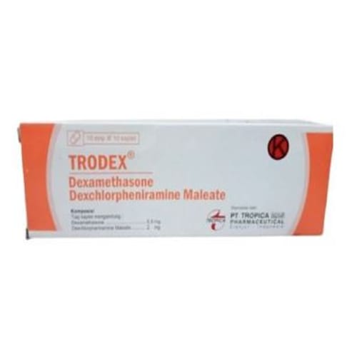 Trodex mengandung zat aktif Dexamethasone dan Dexclorpheniramine maleat. Tersedia dalam bentuk tablet yang didistribusikan oleh Tropica Mas Pharma. Produk ini digunakan untuk mengurangi gejala-gejala rhinitis alergi (hay fever) termasuk rinitis alergi perennial atau seasonal. Trodex bisa juga digunakan untuk bentuk alergi lainnya seperti vasomotor rhinitis, alergi konjungtivitis karena alergen inhalan dan makanan, manifestasi alergi pada kulit misalnya urtikaria dan angioedema, ameliorasi reaksi alergi pada darah atau plasma, dan dermografisme. Trodex merupakan kombinasi yang efektif untuk mengatasi kondisi alergi yang disertai peradangan dimana diperlukan terapi dengan kortikosteroid.